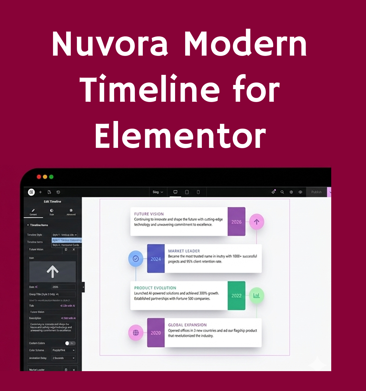 Nuvora Timeline Elementor adds a fully customizable, animated timeline widget to Elementor. Display events, milestones, or history in a visually stunning way with support for multiple color schemes, animation delays, and icons.